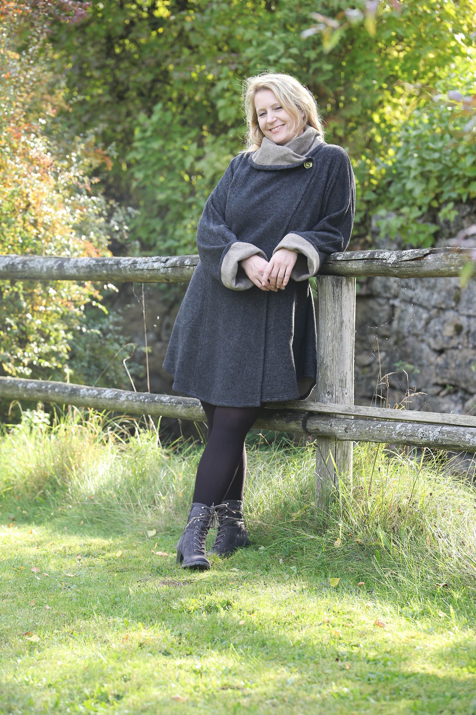 Legere A-Linie mit hohem Schalkragen. Die beiden Vorderteile, hier mit Einsatz und Längsstreifen, liegen übereinander und werden mit nur zwei Knöpfen geschlossen. Aus Lammwoll-Doubleface gefertigt einfach nur leicht und kuschlig....